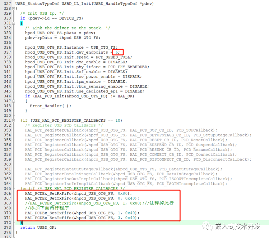 e)修改usbd_conf.c文件,如下: