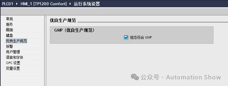 进入“运行系统设置”,启动“组态与GMP 相符”