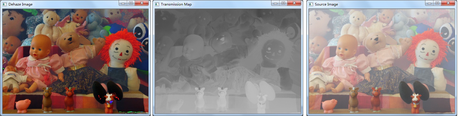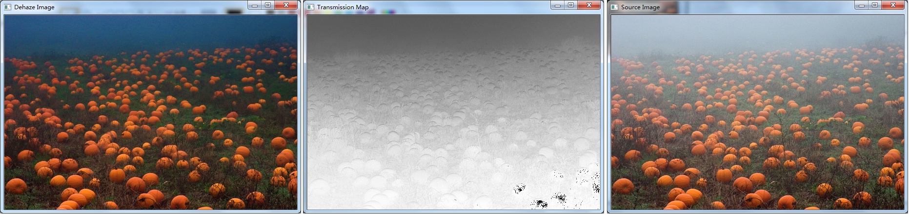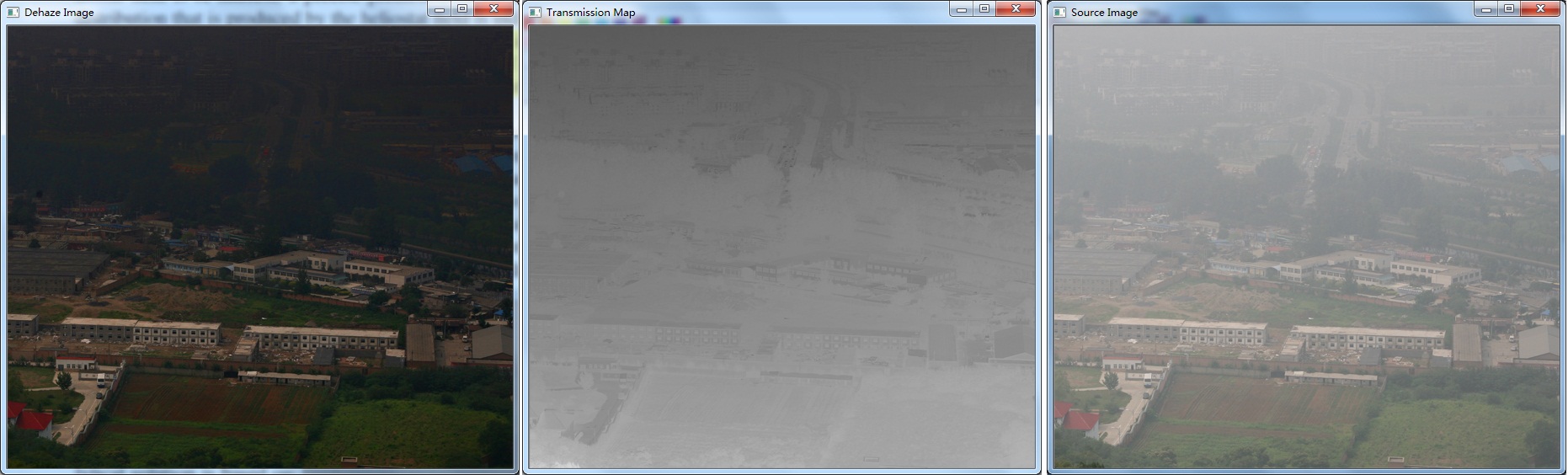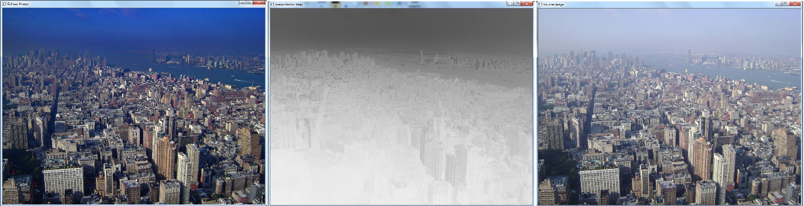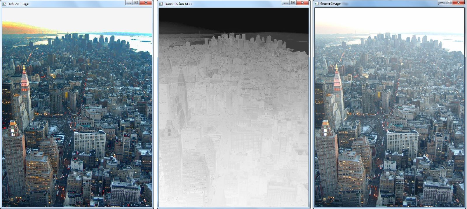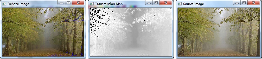 从左到右依次为: 去雾之后的图像,transmission map,原图像
