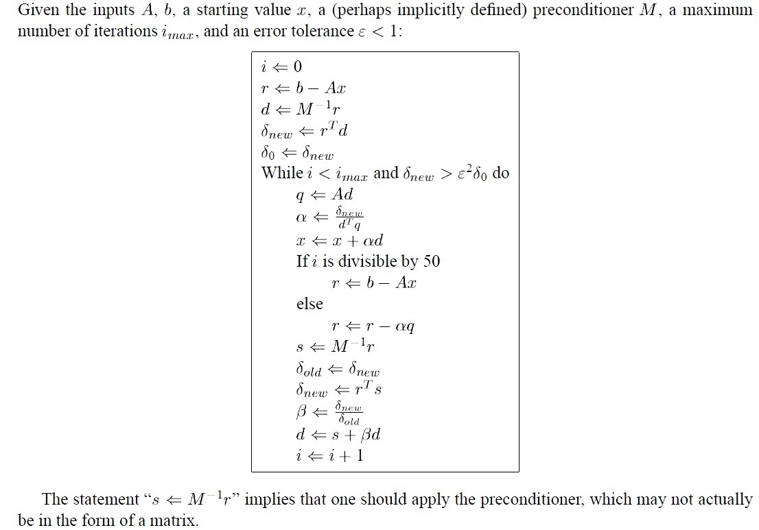 在解大规模稀疏矩阵线性方程组中,使用Preconditioned Conjugate Gradient (PCG)算法,具体参照Jonathan Richard Shewchuk的《An Introduction to the Conjugate Gradient Method Without the Agonizing Pain》,具体伪代码如下: