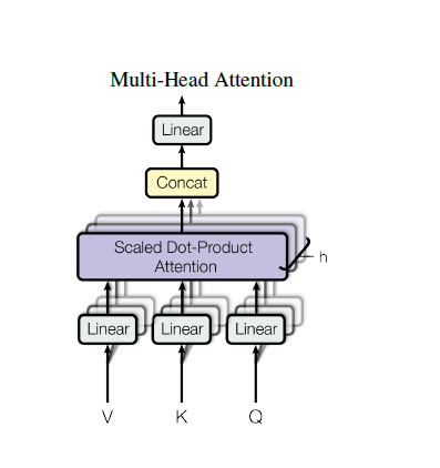 - 首先,Q,K, V 进过了一个线性变换,然后再传入到 Scaled Dot-Product Attention 中, 注意一点,对于不同的 Scaled Dot-Product Attention 而言, 变换矩阵是不一样的,且这些变换矩阵都参与训练。