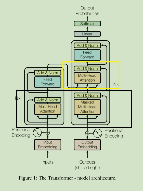 - 在黄色框中, Q 来自Decoder层, 而 K, V来自Encoder的输出 。