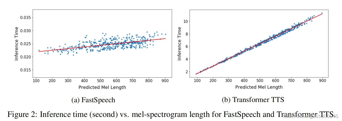 - 图2显示,对于FastSpeech而言,推理延迟几乎不会随着预测梅尔频谱图长度的增加而增加,而Transformer TTS则会增加很多。