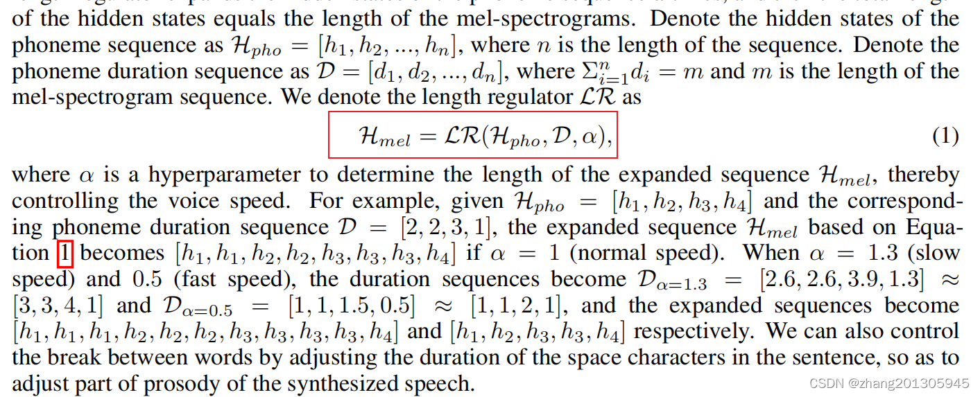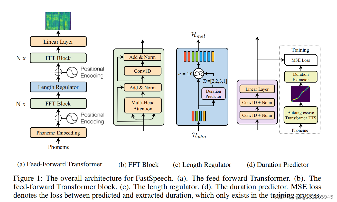 - FastSpeech采用了长度调节器来根据音素持续时间(即每个音素对应的梅尔频谱图数量)对音素序列进行上采样,以匹配梅尔频谱图序列的长度。