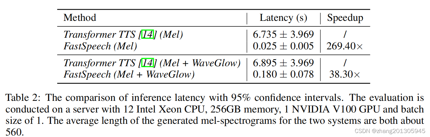 - 然后,我们展示了使用WaveGlow作为声码器时的端到端加速。可以看到,FastSpeech仍然可以实现38.30倍的音频生成加速。