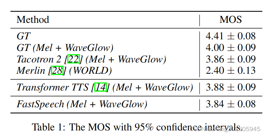 - 结果显示在表1中。可以看出,我们的FastSpeech几乎能够匹配Transformer TTS模型和Tacotron 2模型的质量。