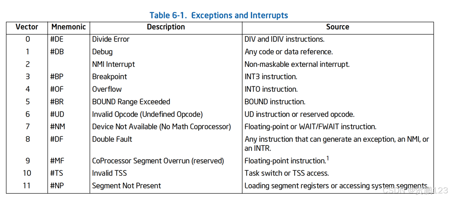 IDT表里里。在IDT里的每个中断和异常被一个向量数字所标识。注意:程序定义的几个额外的中断,但没有在