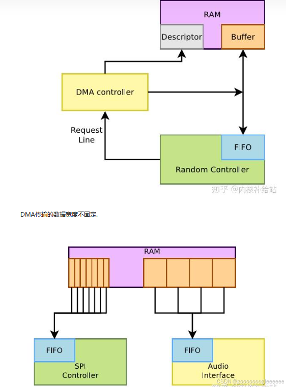 DMA支持的地址,不一定是64bit,所以在device注册时,需要指定src addr、dst addr的地址位宽(mask)。由于一般情况下DMA Device支持的物理地址位宽为32位,所以内核将DDR 32bit范围内的部分做成了一个DMA zone,用于给DMA设备分配可映射访问的buffer。