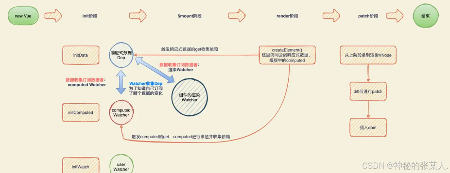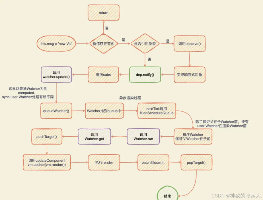 当修改我们申明的某个属性时,会触发属性的set方法,set方法会将dep.subs数组中收集的Watcher实例对象进行更新,即触发我们定义在computed和watch里面的函数。