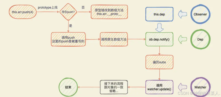 一定要注意!!!数组的依赖收集跟对象的属性是不一样的。对象的属性经过深度遍历后,最终就是以一个基本类型的数据为单位收集依赖,但数组仍然是一个引用类型。