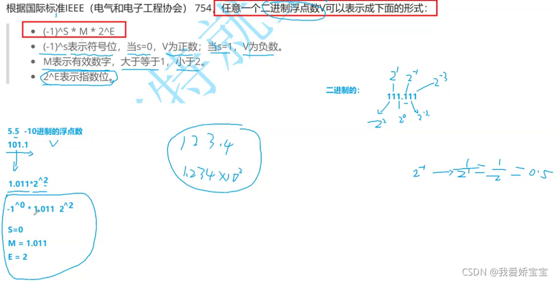 根据国际标准IEEE(电气和电子工程协会) 754,任意一个二进制浮点数V可以表示成下面的形式: