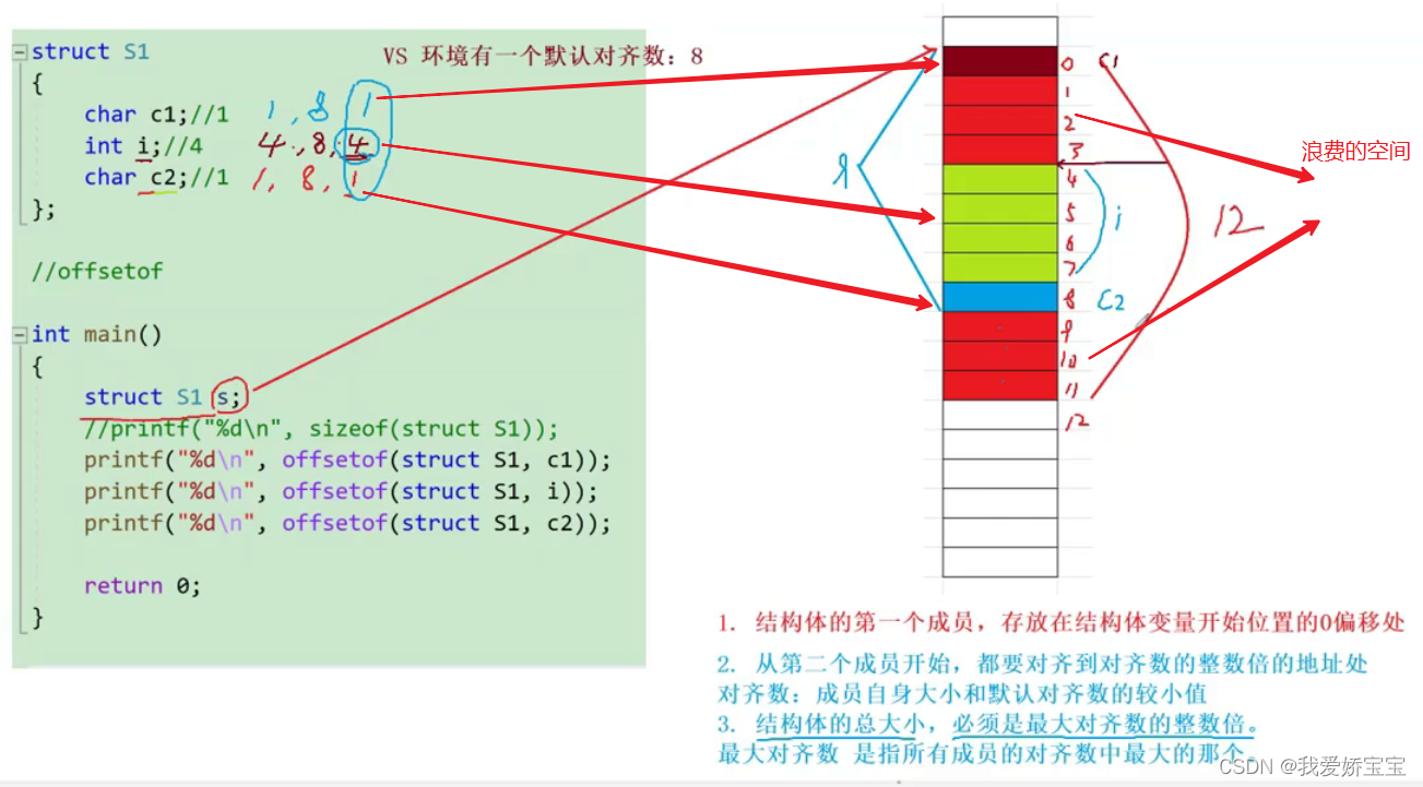 则此时整个结构体的大小为0~8,9个字节空间,结构体的总大小需要是最大对齐数的整数倍,最大对齐数是三个对齐数1 4 1中的4,则结构体的总大小是4的倍数,则让 9 再浪费三字节空间到了偏移量11的位置,总共12字节空间