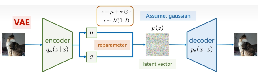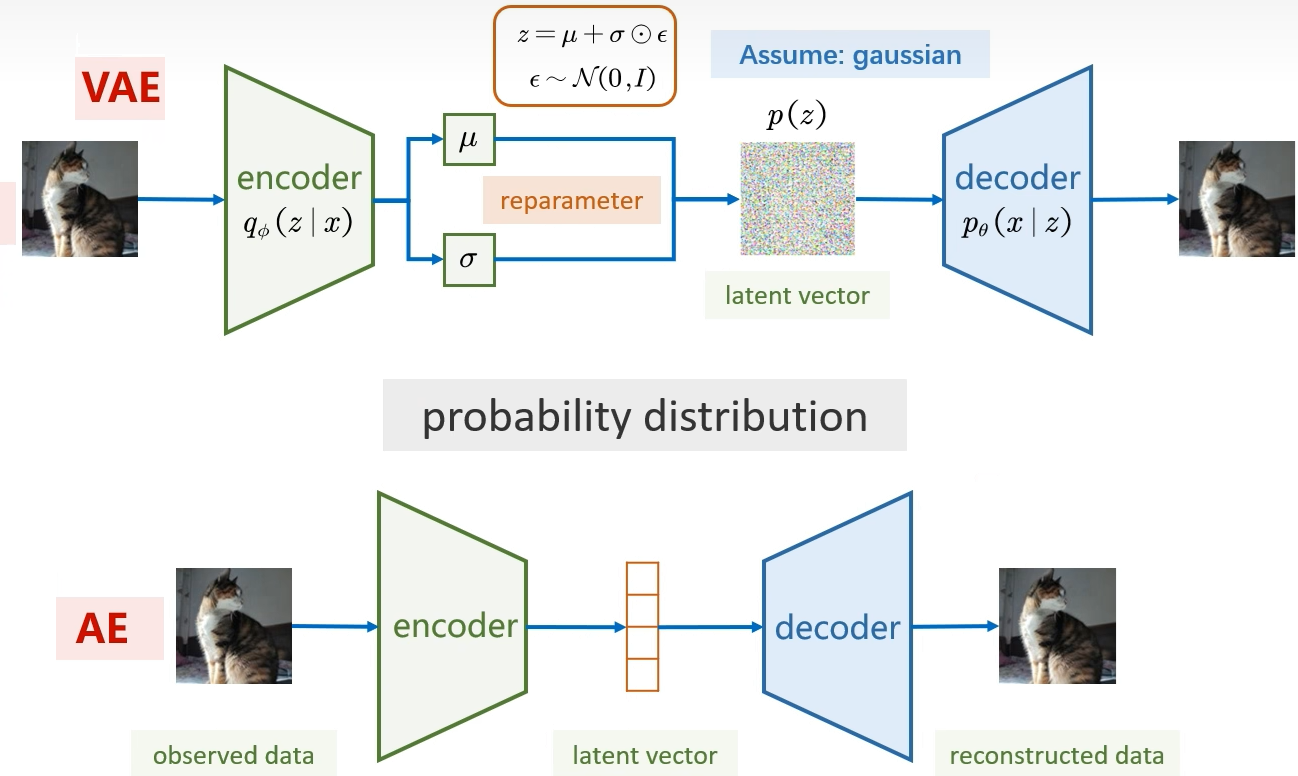 VAE 在 AE 基础上加入了概率分布约束,流程是 **“输入→编码出分布→采样隐向量→解码→重构” 的概率流程 **: