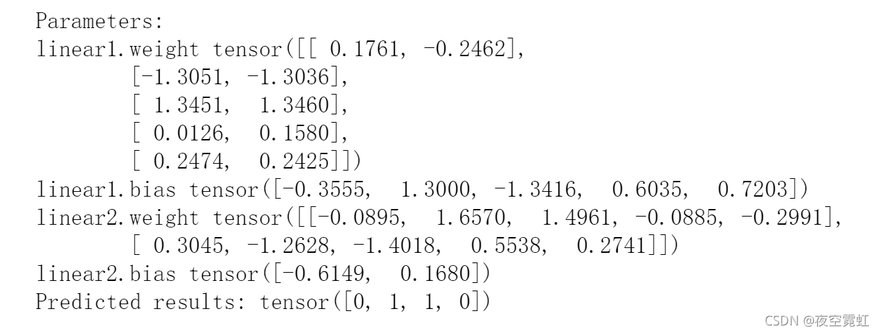 输出结果如下:首先,输出网络的参数值,包括两个线性映射层的权重和偏置项的值;然后,输出网络对训练数据的预测结果,即[0,1,1,0],其与原训练数据相同,说明该组参数能够正确处理异或问题(即线性不可分问题)