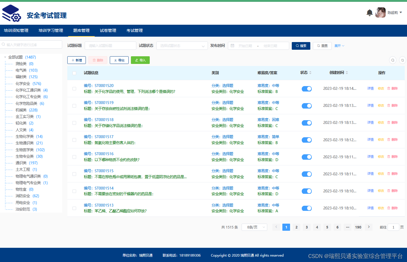 本系统包括学习、练习测试、考试三大功能模块及相关管理功能,共有安全通识、化学、生物医学、机械建筑、电气、辐射、特种设备、激光安全、消防安全、非医用Ⅲ类射线装置、非医用Ⅲ类射线装置、电离辐射安全与防护基、生物土壤试验安全类、危险作业类、电离辐射法律法规、网络安全、等十六个大类安全题库,分为判断题、多选题、单选题等多种题型。本系统可根据各高校的实际情况,设置考试相关的内容,调整、修改题库和试题,操作简单、适用性强,知识涵盖面广,适用于高校开展实验室安全培训与考试工作。