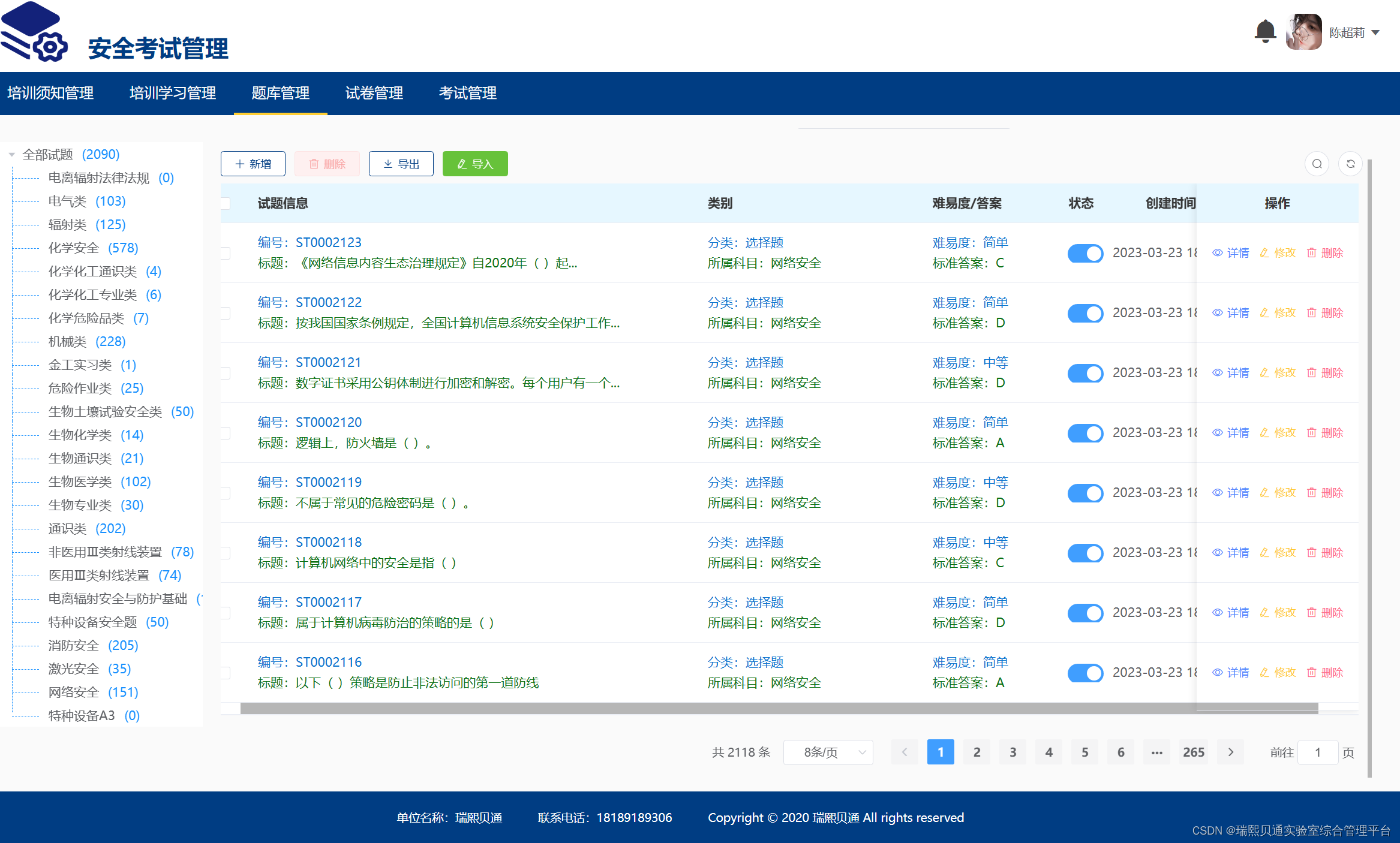 包括在线学习、在线练习、培训学习、模拟考试、准入考试、安全题库、安全须知七大功能模块及题库、信息公告等相关管理功能,共有安全通识、化学、生物医学、机械建筑、电气、辐射、网络安全、激光安全、特种设备安全题、电离辐射安全与防护基础、医用Ⅲ类射线装置、非医用Ⅲ类射线装置、电离辐射法律法规等十三个大类安全题库,分为是非题和单选题两种题型。可设置考试相关的内容,调整、修改题库和试题。