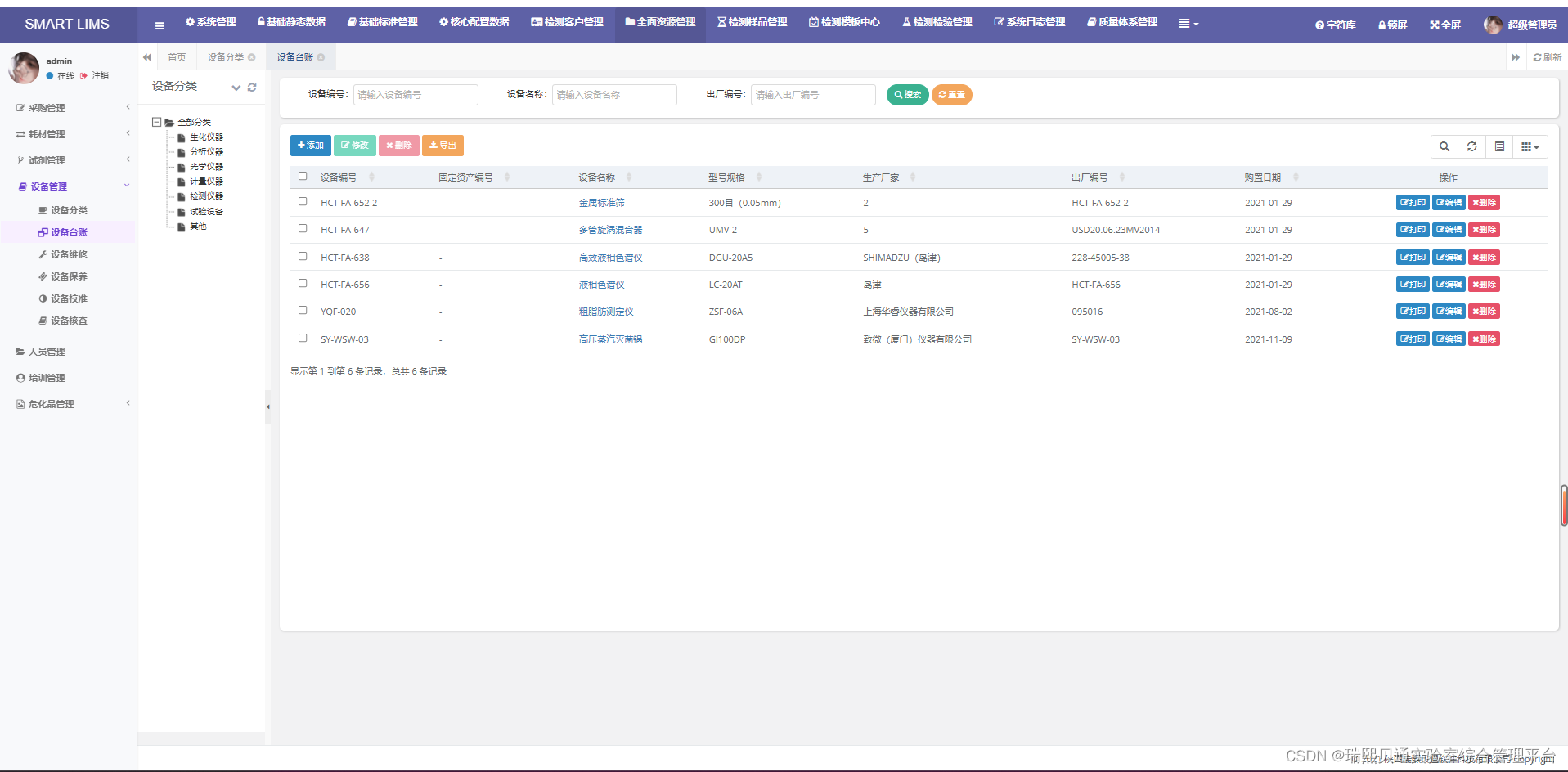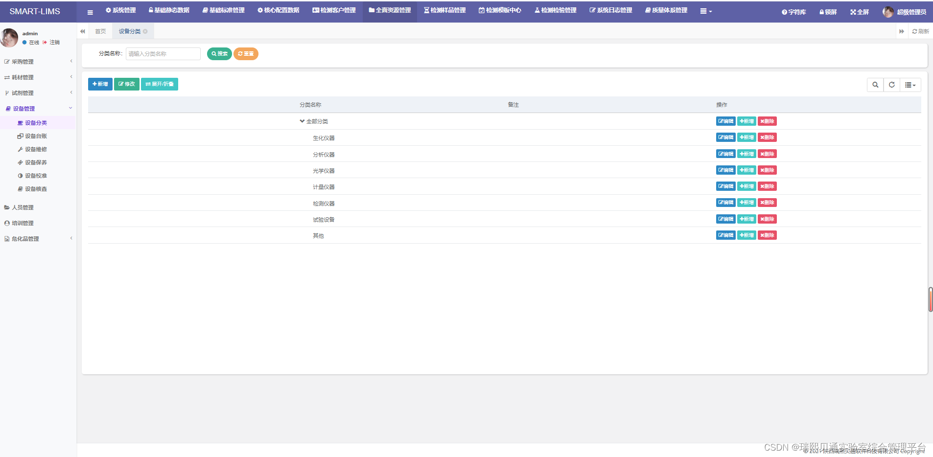 对系统中的设备进行分类,如“检测设备”、“试验设备”、“计量设备”、“分析设备”、“光学设备”、“生化设备”等
