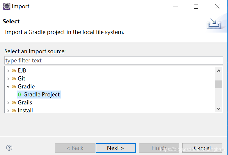 安状成功后从Eclipse->file->import ->Gradle->Gradle project 选择刚才新建的项目录