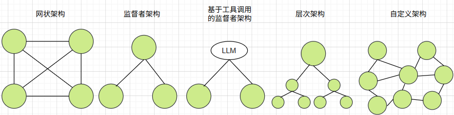 5)自定义架构。网状架构、监督者架构和层次架构的综合。每个智能体仅与部分智能体交互,部分智能体作为监督者,有些工作流时固定的