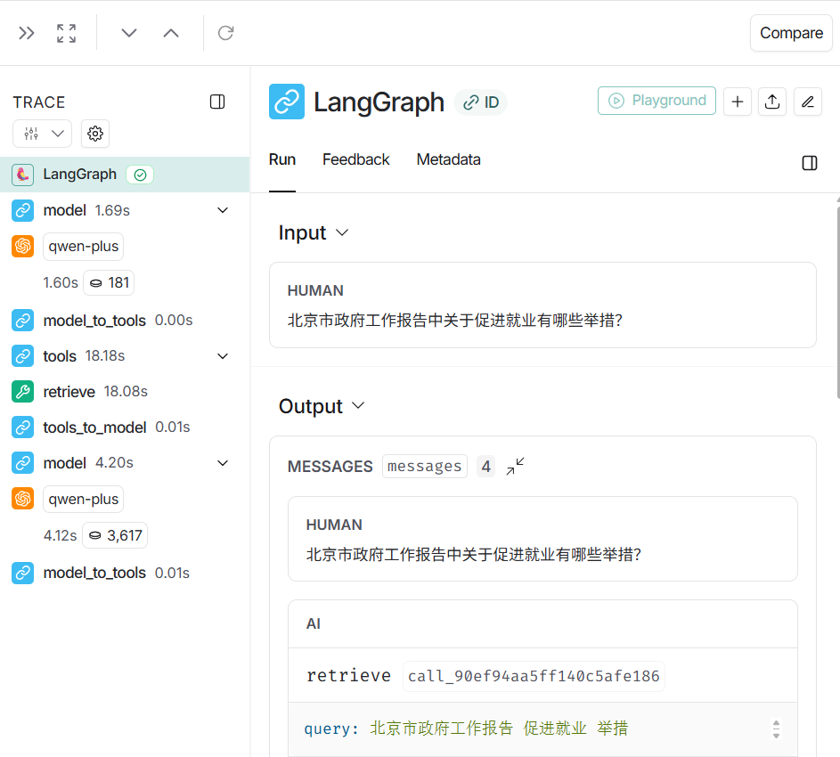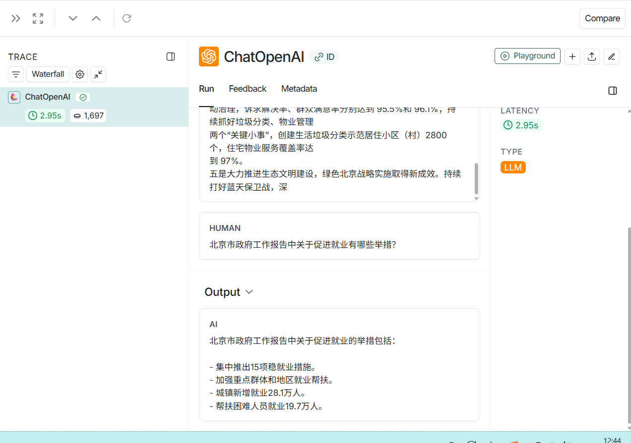 登录LangSmith平台,可以看到调用大模型时的输入、输出:
