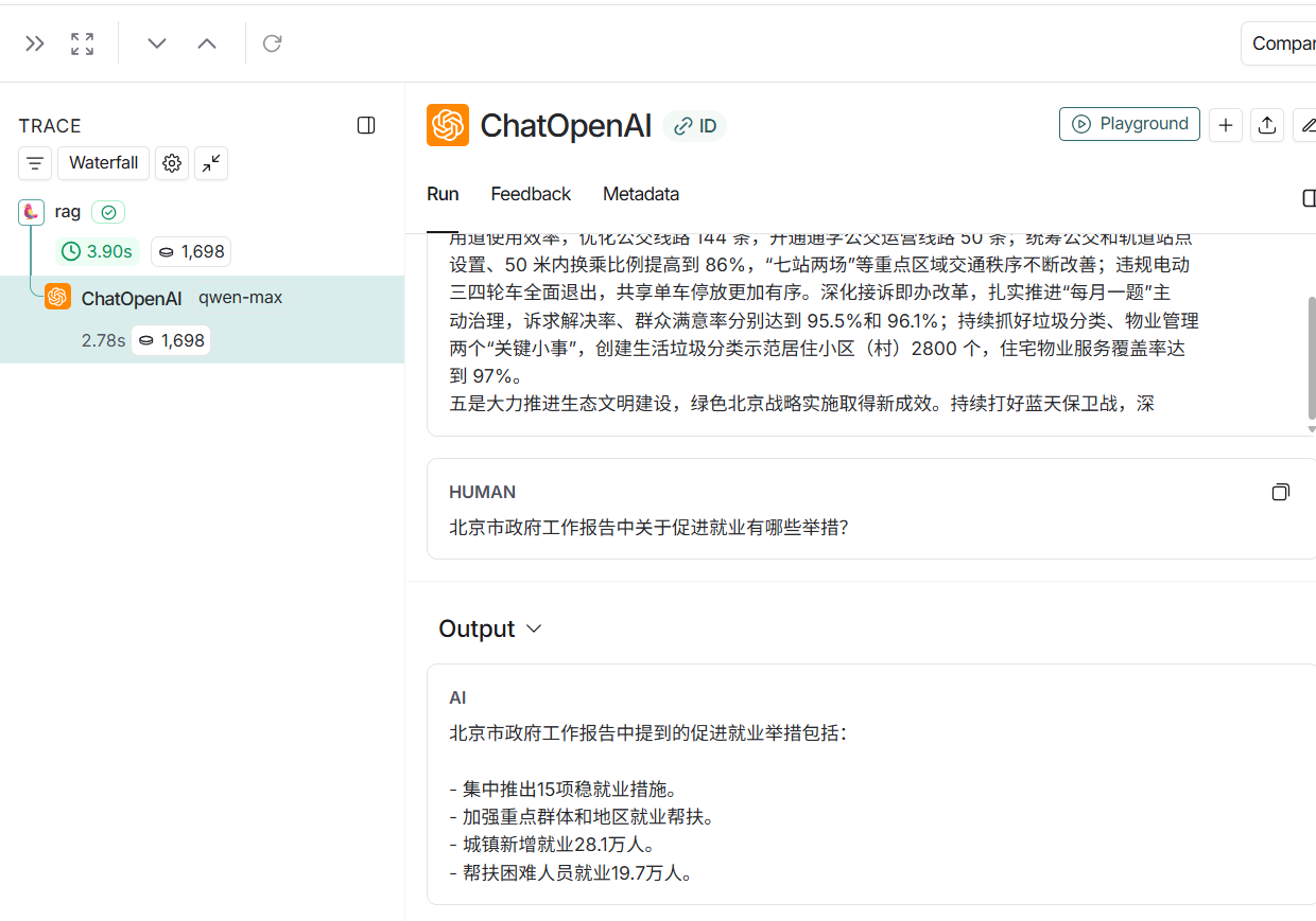 以上示例中仅跟踪大模型调用,还可以对整个应用进行跟踪,此时需要用@traceable对rag方法增加注解: