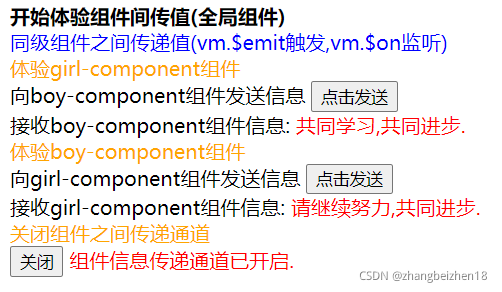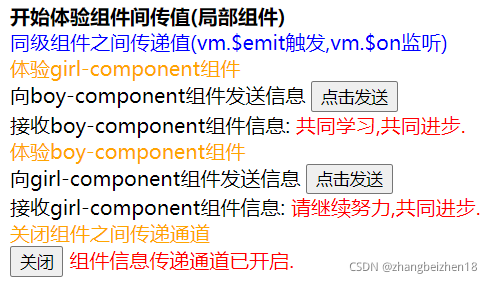 体验Vue.component注册的局部组件,同级组件之间传递值,使用vm.$emit触发事件,使用vm.$on监听事件,需要创建一个全局的var vm= new Vue()。
