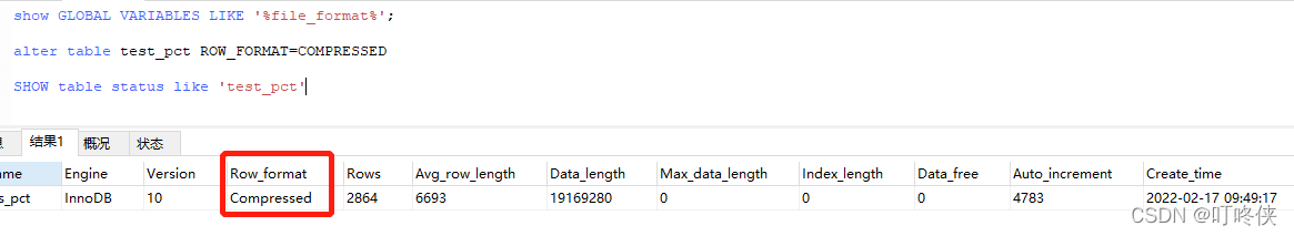 2、alter table test_pct ROW_FORMAT=COMPRESSED