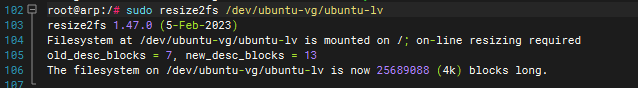 sudo resize2fs /dev/ubuntu-vg/ubuntu-lv
