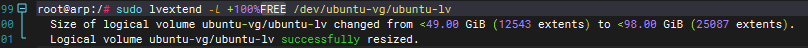 sudo lvextend -l +100%FREE /dev/ubuntu-vg/ubuntu-lv