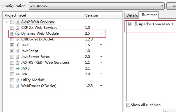 1.修改属性->Project Facets。选择Dynamic Web Module(版本是2.5,因为我这里是tomcat6只支持2.5,tomcat7支持3.0)和Tomcat,点应用。