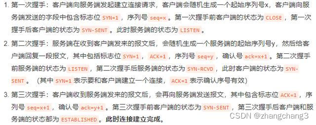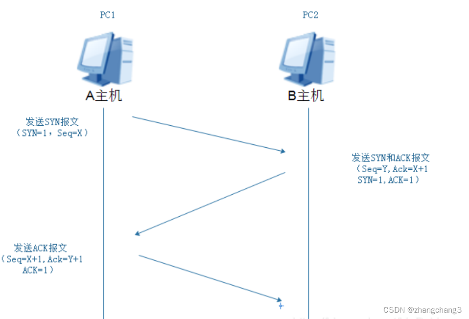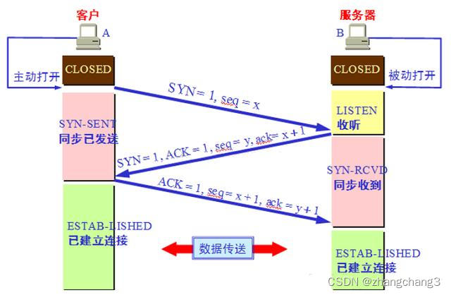 第一次:客户端发送建立连接的请求,TCP的初始序号x和控制位SYN=1请求标志,ACK=0