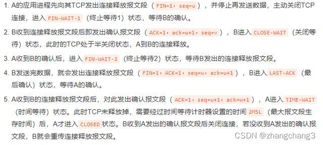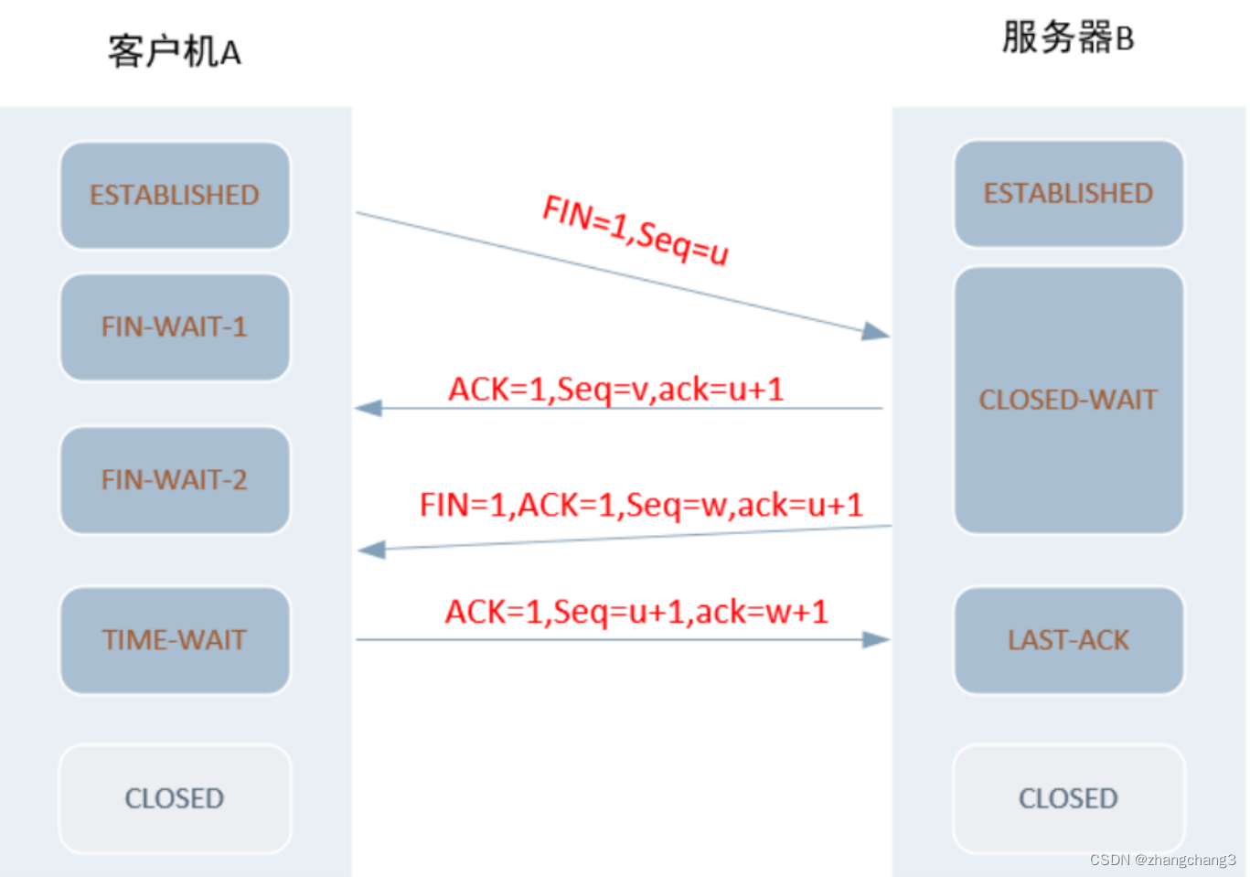 • 第三次断开:客户端收到服务器确认结果后,进入FIN-WAIT-2状态。此时服务器发送释放FIN=1信号,确认标志ACK=1,确认序号ack=u+1,自己序号seq=w,服务器进入LAST-ACK(最后确认态)