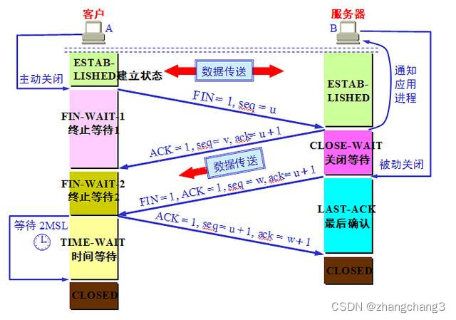 • 第四次断开:客户端收到回复后,发送确认ACK=1,ack=w+1,自己的seq=u+1,客户端进入TIME-WAIT(时间等待)。客户端经过2个最长报文段寿命后,客户端CLOSE;服务器收到确认后,立刻进入CLOSE状态