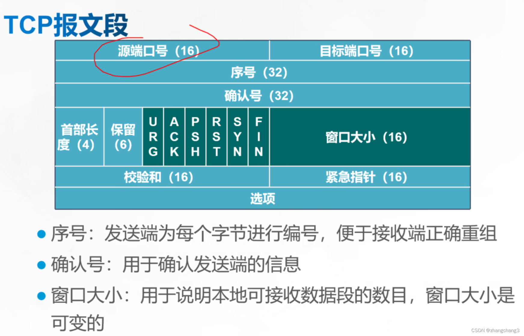 源端口、目标端口: 计算机上的进程要和其他进程通信是要通过计算机端口的,而一个计算机端口某个时刻只能被一个进程占用,所以通过指定源端口和目标端口,就可以知道是哪两个进程需要通信。源端口、目标端口是用16位表示的,可推算计算机的端口个数为2^16个,即65536 (0-65535)。