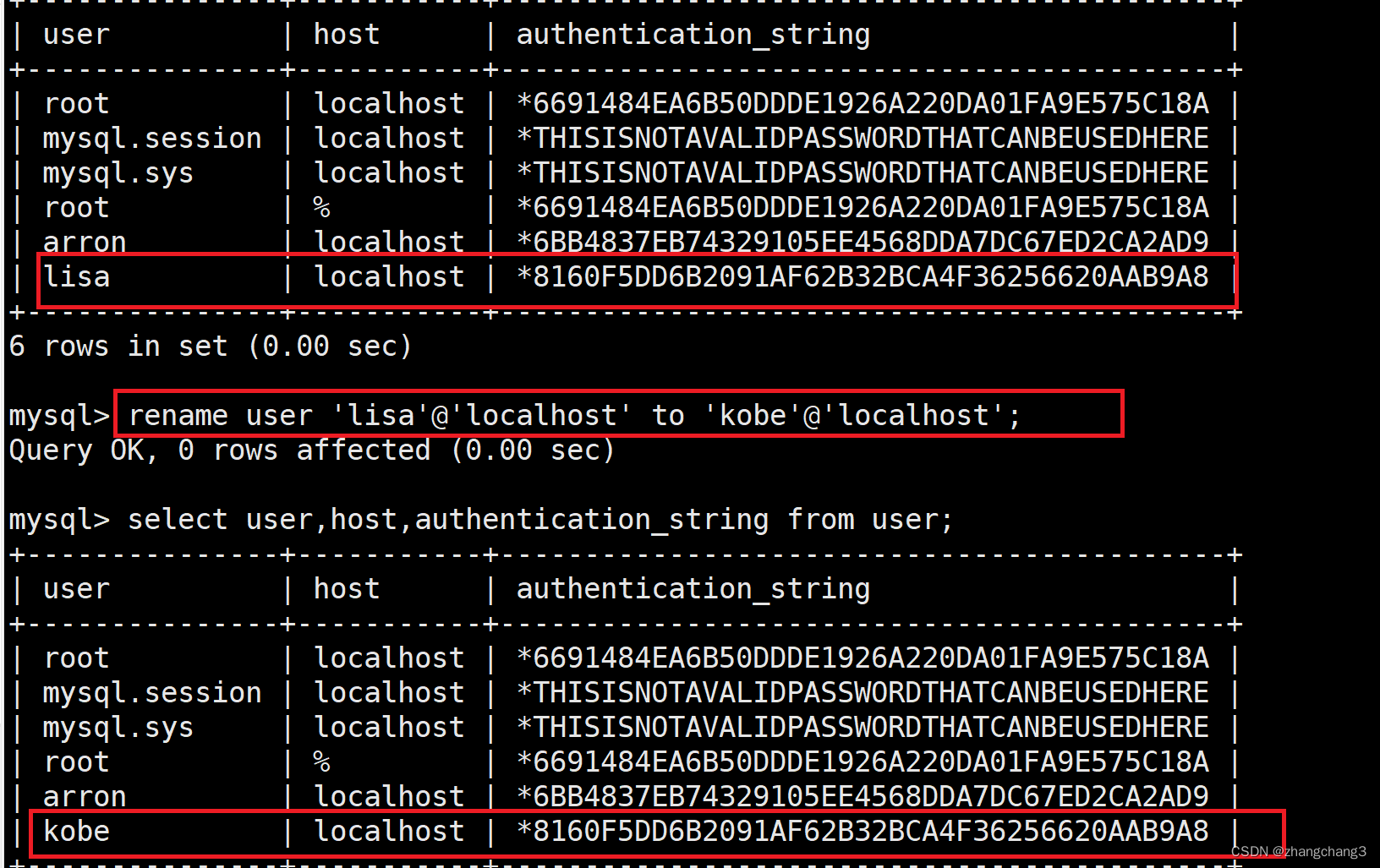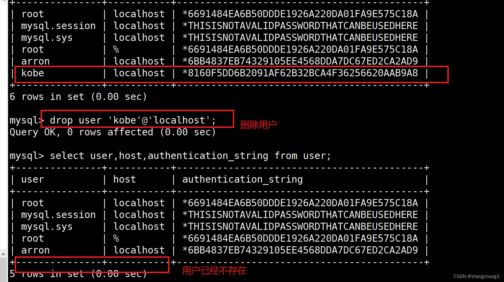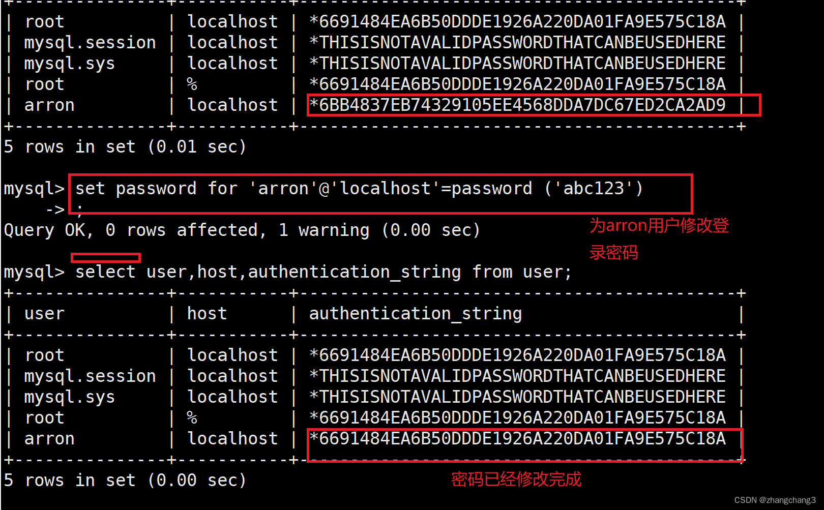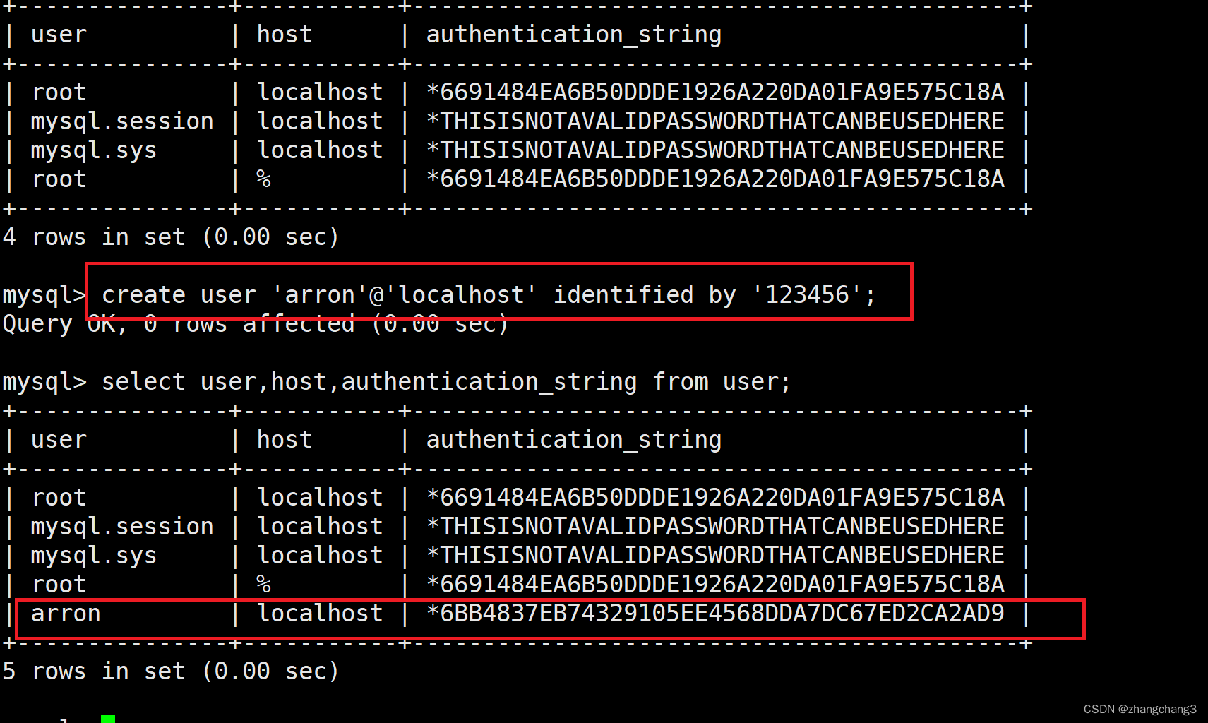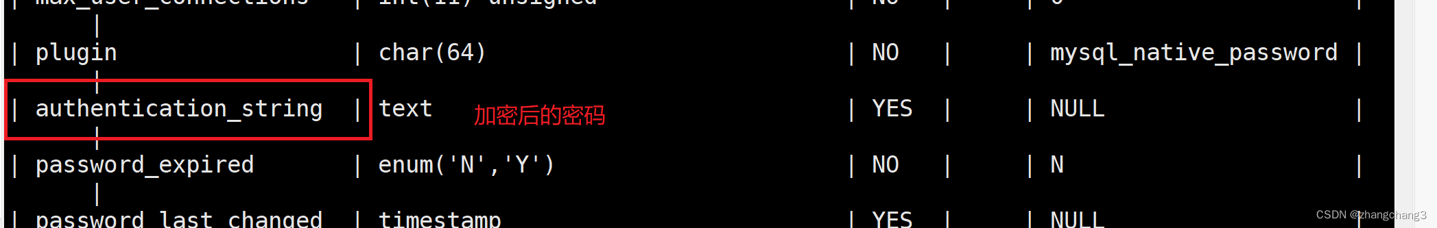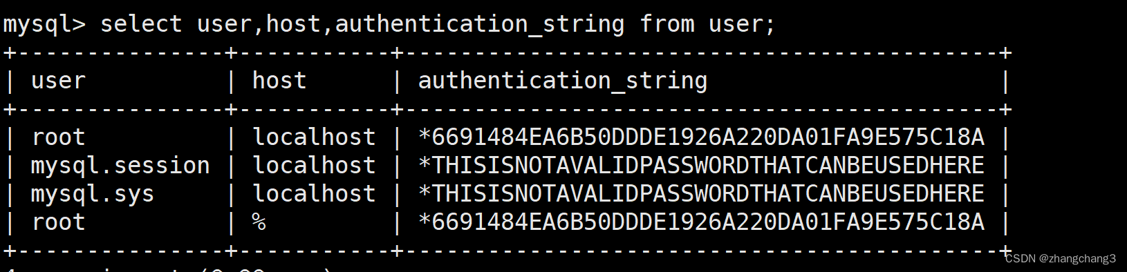 select user,host,authentication_string from mysql.user; #查看用户信息