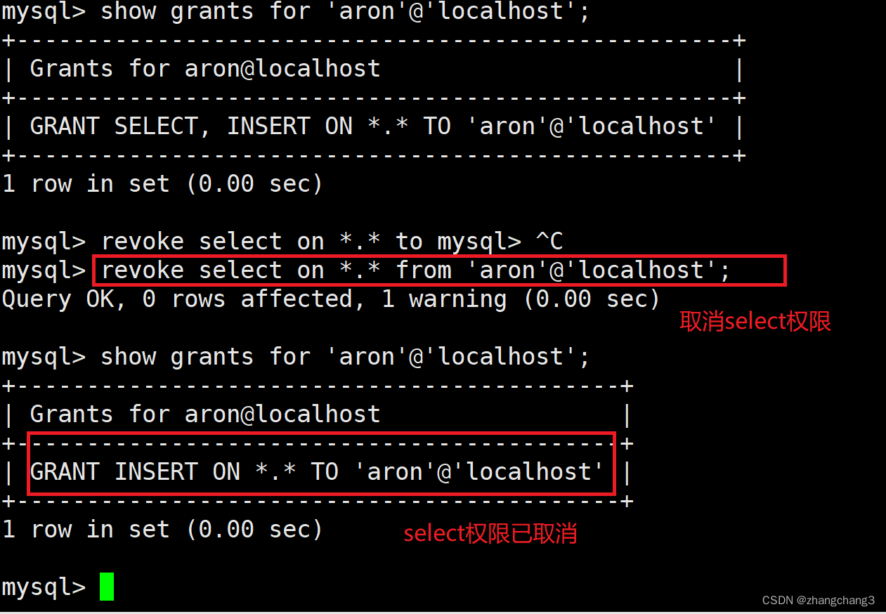 revoke 权限列表/ALL on 库名.表名 from 'username'@'address'; #撤销用户的权限