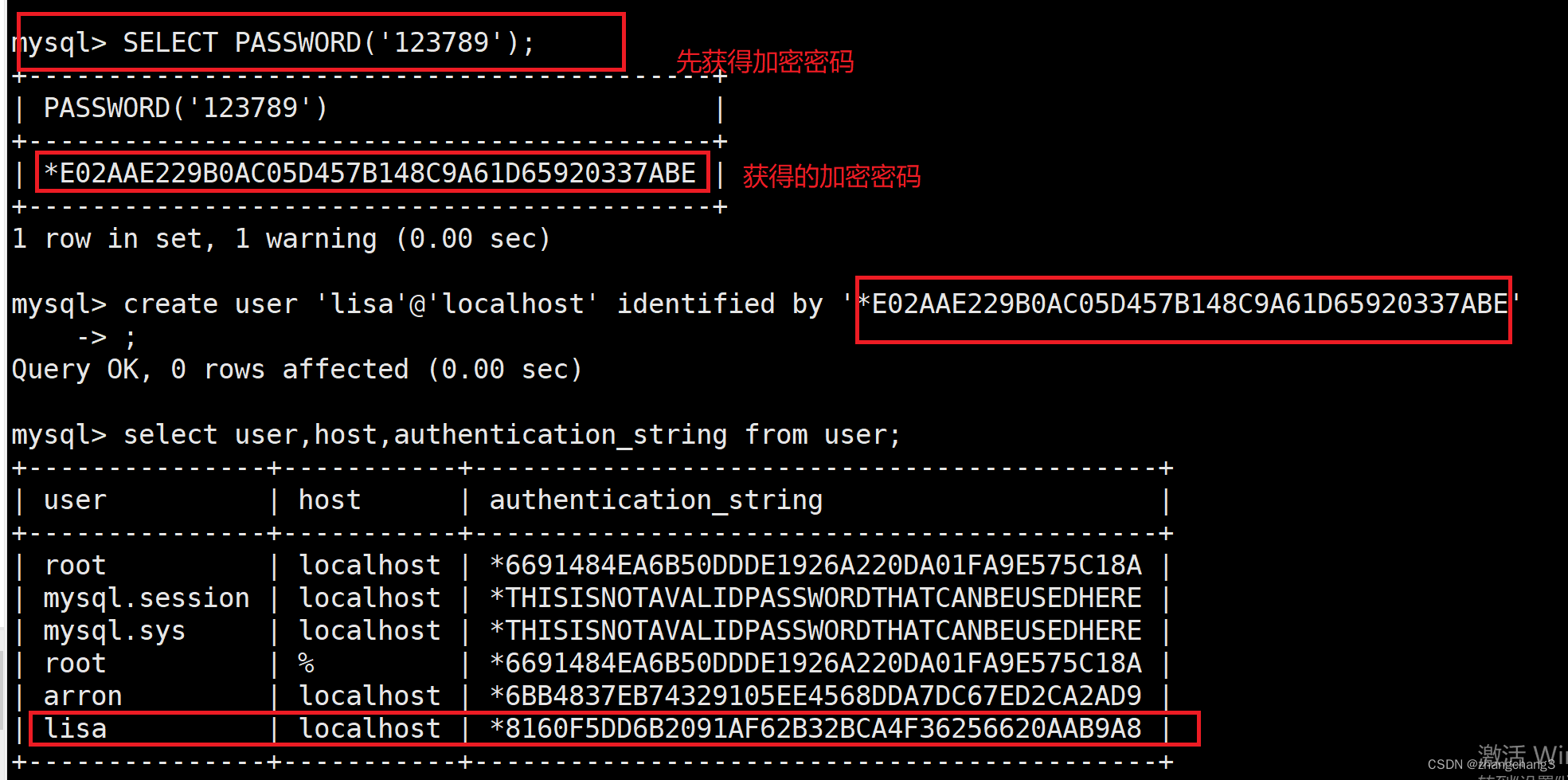 CREATE USER 'lisi'@'localhost' IDENTIFIED BY PASSWORD '加密的密码';