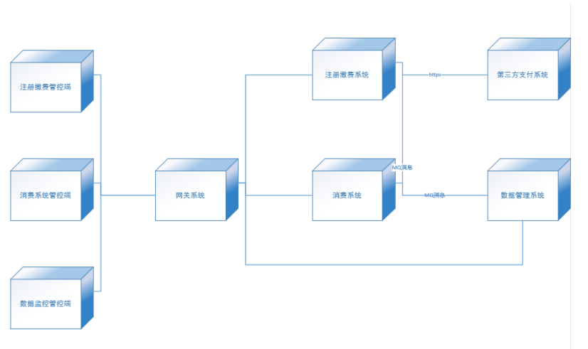 消费系统管控端和消费系统职责为消费管理和账户余额处理,部署4台服务器,需要依赖网关个数据管理系统;