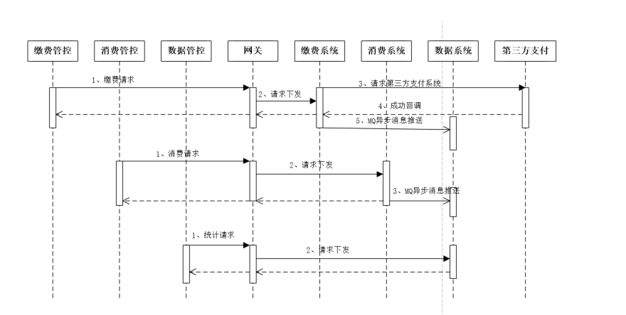 1. 缴费时,通过缴费管控端发起缴费请求,网关接受到请求后做路由分发到缴费系统 ,缴费系统请求第三方系统发起请求通知,支持成功后发送异步消息到mq,数据系统通过mq处理异步消息;
