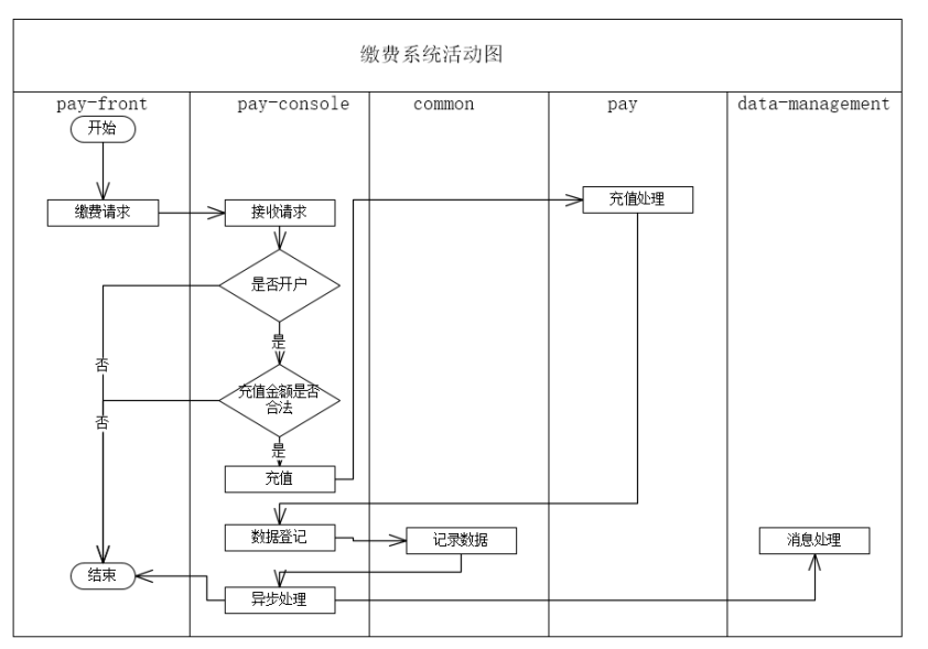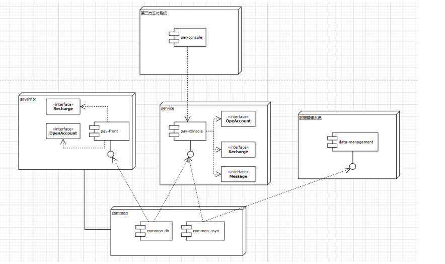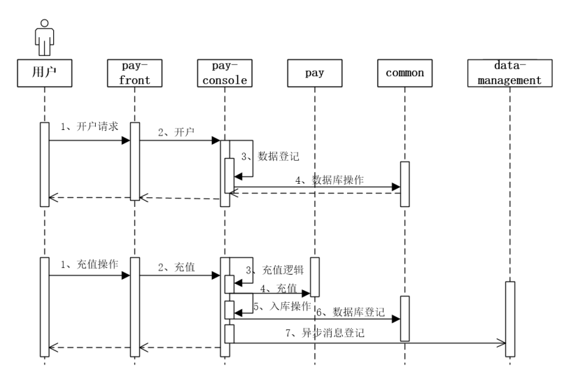 缴费系统一共分为3个组件,pay-front的主要功能是做开户和充值的可视化操作,需要依赖组件pay-console做业务逻辑处理,并发送异步消息的数据管理;还要依赖common组件提供最基础的框架功能。