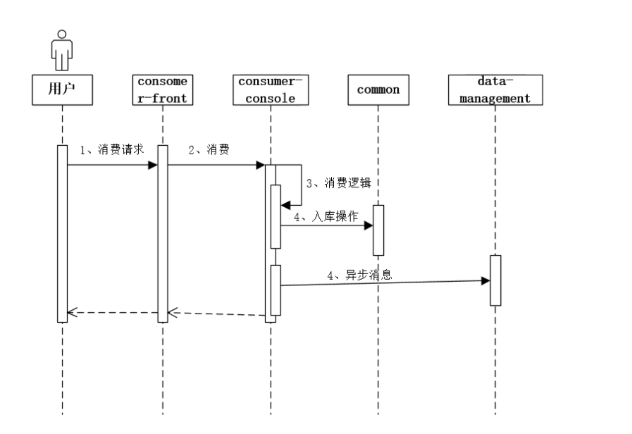 在消费场景中,consumer-console收到消费请求最业务逻辑处理,然后进行数据库登记,最后发送异步消息至数据管理中心;