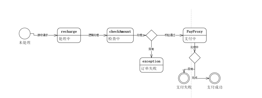 初始化状态为未处理,接受请求后标记为处理中状态,在业务逻辑检查是改为检查中状态,检验失败为订单失败,检验通过为支付中订单,支付成功和支付失败两个状态。