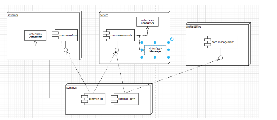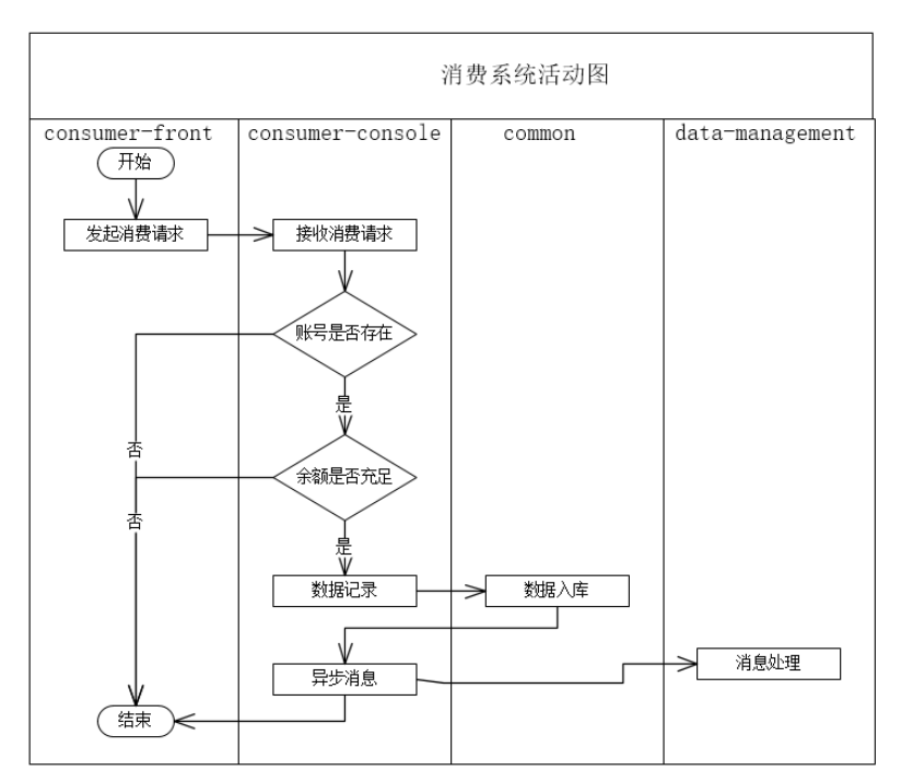 消费系统一共分为3个组件,consumer-front的主要功能是做消费的可视化操作,需要依赖组件consumer-console做业务逻辑处理,并发送异步消息的数据管理;还要依赖common组件提供最基础的框架功能。