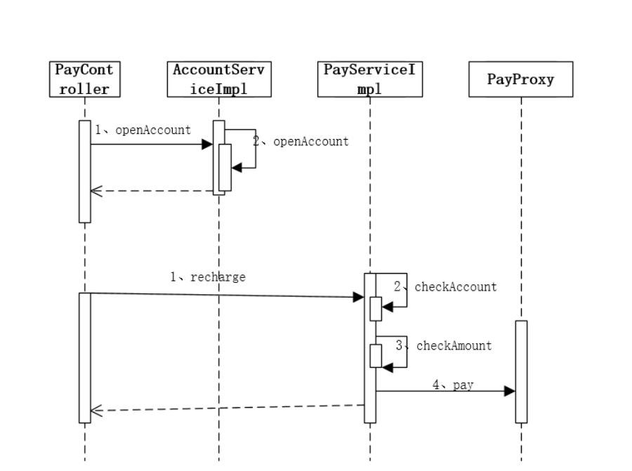 PayServiceImpl和接口AccountServiceImpl分别实现接口PayService、AccountService,PayController聚合两个接口,PayService并调用支付代理。