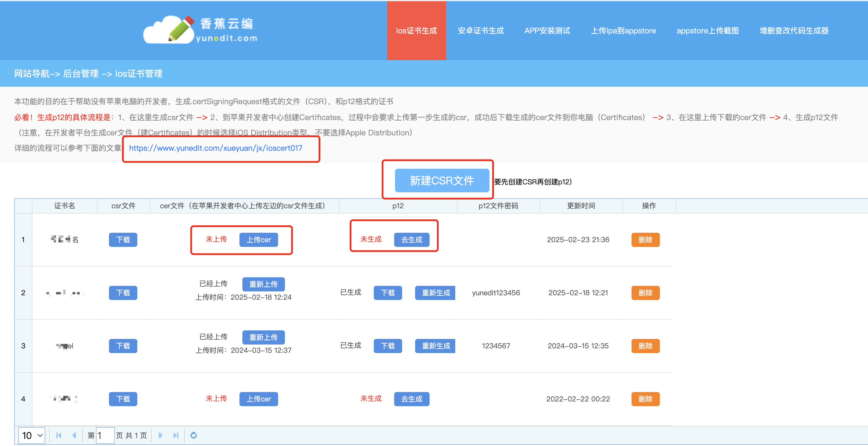 (3)使用在苹果开发者中心生成的cer文件,去香蕉云编再转成p12格式的私钥证书。