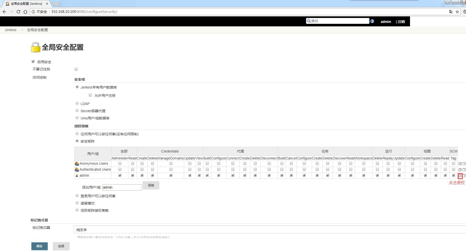 在授权策略中选择 “安全矩阵”,添加用户,输入我们安装 Jenkins 时设置的用户名。