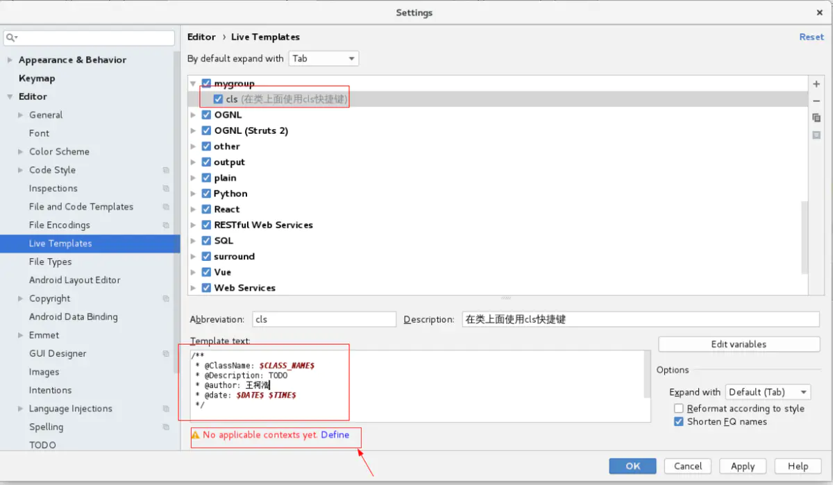 注:$PARAMS$是故意无星号开头,template的Abbreviation是*,template的第一行也是*,这样输入/**回车就能输出注释