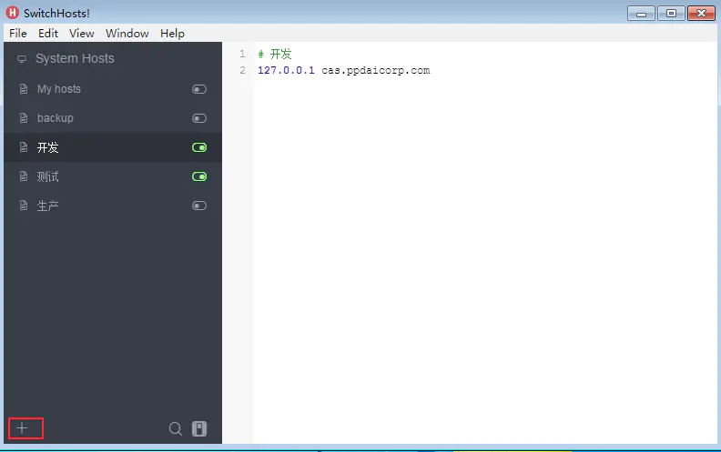 1、点击左下角的 + 按钮添加一个自己定义的hosts的名称,然后在框内写入自己要定义的 IP<——>域名,然后点击小按钮启动就生效了
