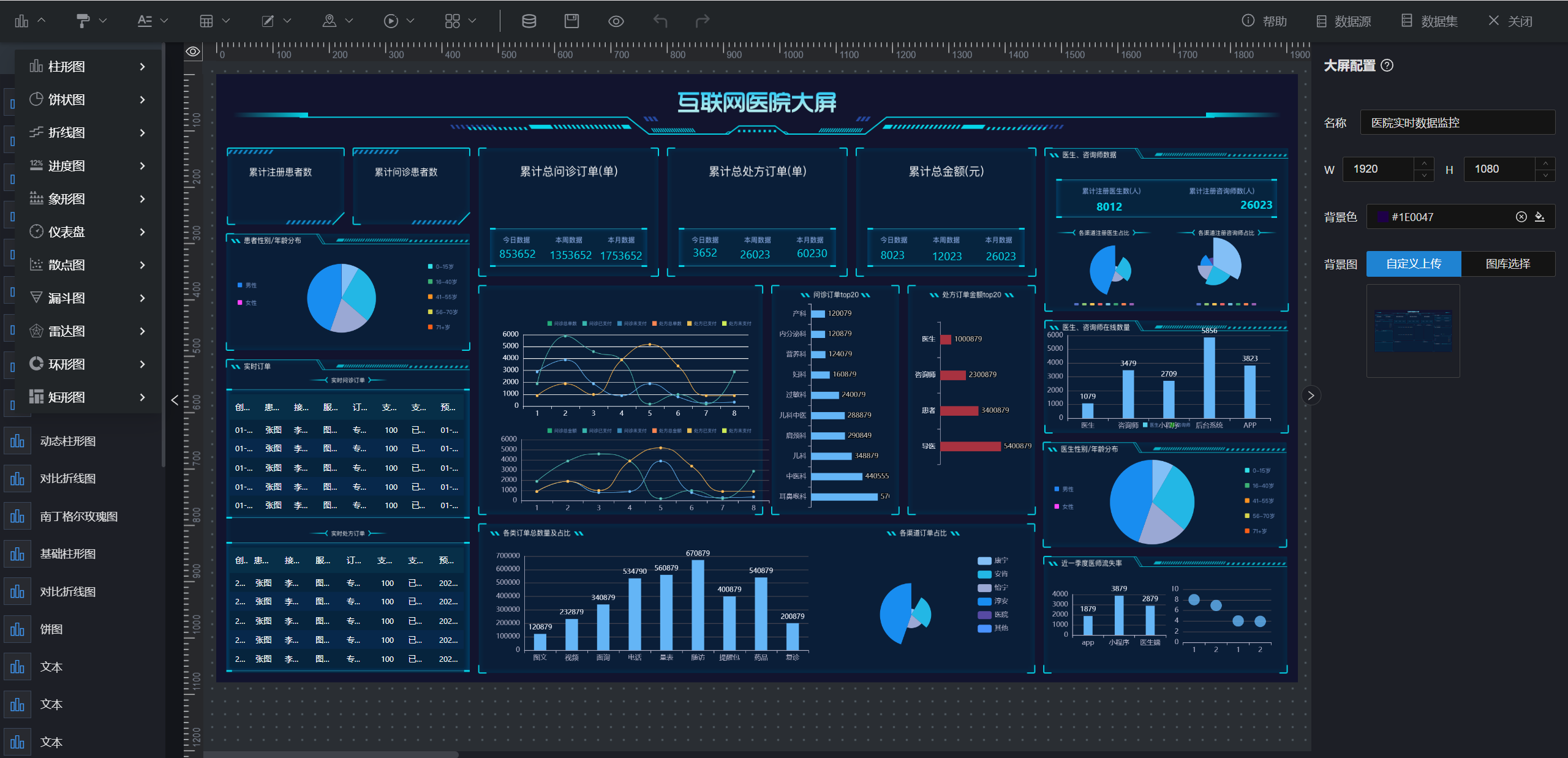 - 大屏设计器支持几十种图表样式,可自由拼接、组合,设计炫酷大屏