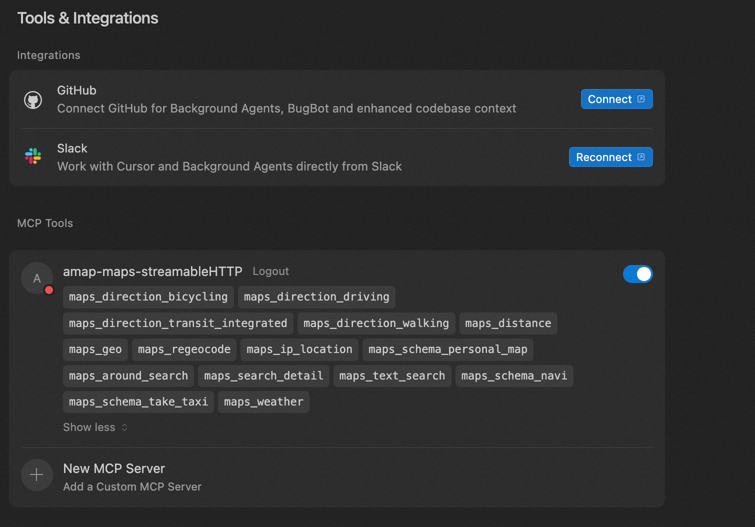 Cursor平台支持以Streamable HTTP方式接入高德MCP服务。按照官方指南,将申请到的Key配置到Cursor中,完成服务对接。详细步骤参考:高德开放平台 - MCP接入指南